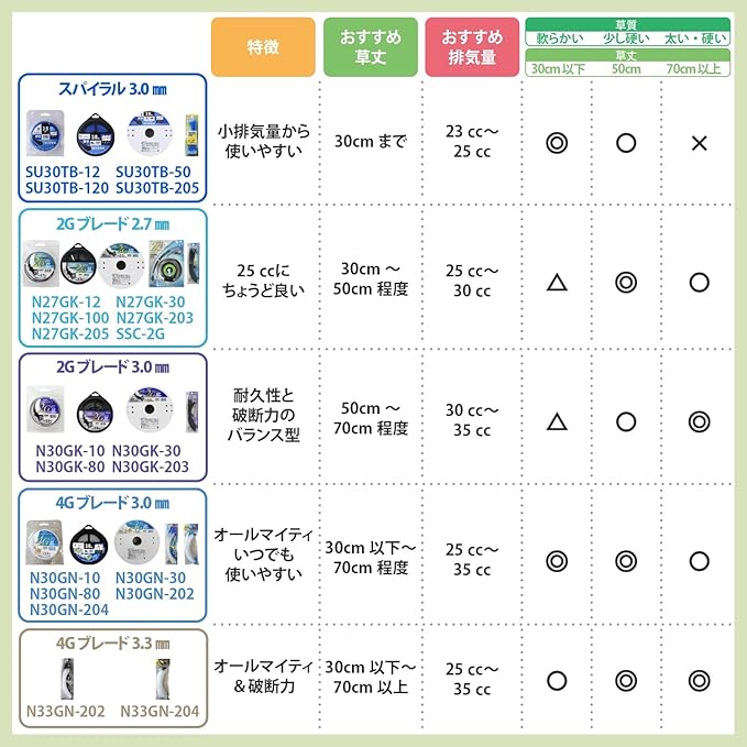【特徴】草刈用ナイロンコード(ライト用替えコード)。ナイロン材料・コード成型・せん断加工などすべて日本国内で行っております。コードの交換は差し込むだけのワンタッチ式で簡単に交換が可能です。キックバックが起きにくいナイロンコードは安全性が高く、さらに草を粉砕しながら刈り取りを行うので、草刈作業後の草を集める作業を必要としません。刈り取った場所に草が溜まらなければ、刈り具合も確認できるので刈残しも少なく済みます。先細りしない新形状で破断力が高く、のこぎり状の刃形状は切れ味抜群で、初秋の硬くなりがちな草でも高い切れ味を発揮します。