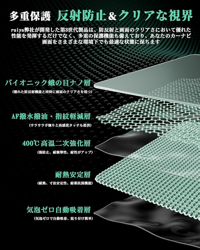 【抜群な反射防止・鮮明な視界】弊社の シビック fl1 fl4 ガラスフィルム はバイオニック蛾の目仕組みと最先端技術を融合し、自然界の反射防止メカニズムを完璧に擬する反射防止フィルムです。これによってさまざまな環境での運転中にも、ナビゲーションの視覚がこの上もない反射防止機能を持ち、同時に見やすさも損なわれていない。日中や夜間の映り込みによる視界の妨げに悩むことはもうありません。アンチグレアフィルムが好きな人に絶対におすすめです。
