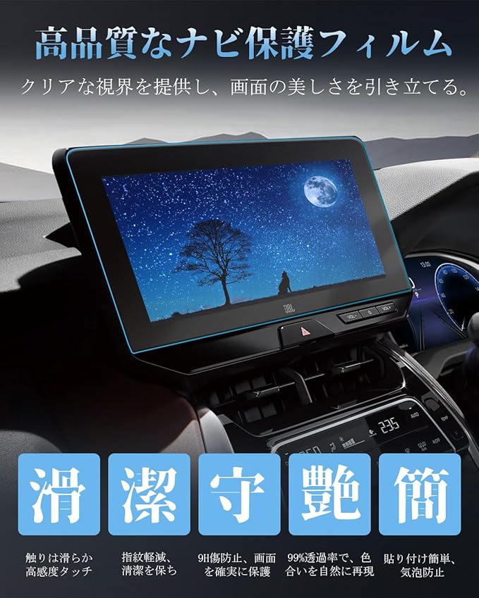 【超卓なHD映像&抜群の保護力】80ハリアー ナビ 保護フィルムは、96%の高透過率を誇り、HDクリアな鮮明さと輝きをキープし、さらに反射や映り込みを軽減します。驚くほど美しい視覚効果と鮮やかなオリジナルカラーをお楽しみいただけます。9H高硬度でキズや割れから守れ、長持ちする耐久性のあるハリアー80系専用アクセサリーです。