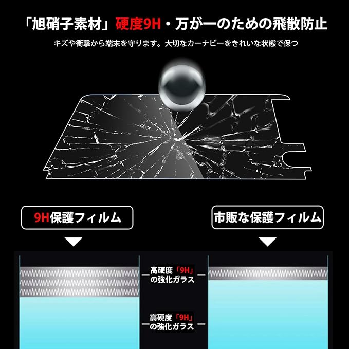高硬度「9H」の強化ガラス:5つの層で薄くて鮮やかで強いガラスフイルムを実現。最近は液晶パネルに直接指でタッチしたりします、液晶画面は傷がつきやすいです。ナビ液晶を長く大事に使っていきたいなら、このカーナビ液晶保護フィルムをおすすめです。キズや衝撃から端末を守ります。