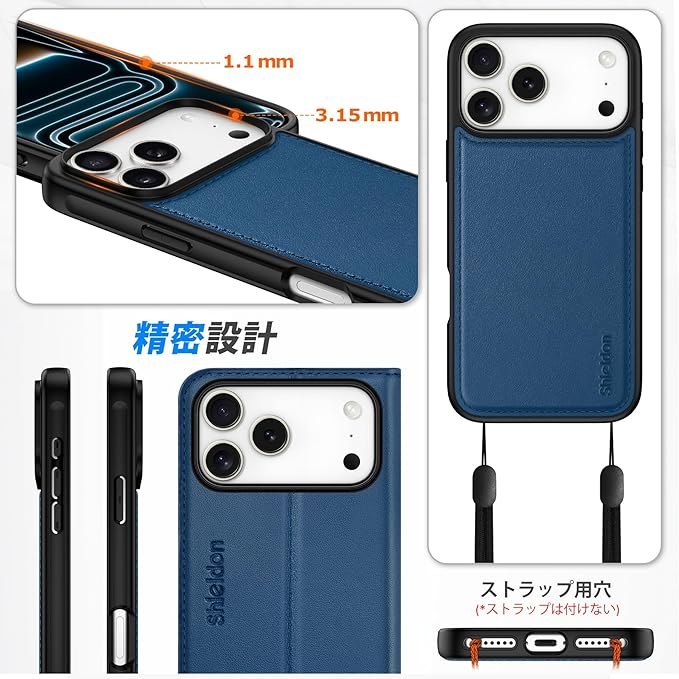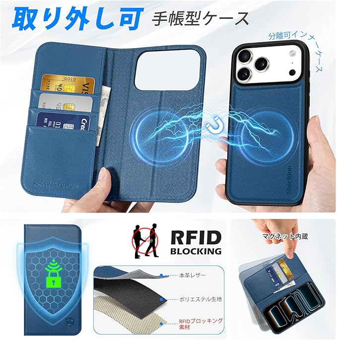 SHIELDON iPhone 17ProMax 対応 手帳型ケース 2in1分離式 本革レザー 6.9インチ 5G カード収納 [RFIDブロッキング] 取り外し自由 カバー単体ワイヤレス充電可 横置きスタンド機能 ストラップ穴付き 衝撃吸収 アイホン 17プロマックス 対応 スマホケース 2025年発売 2-in-1分離式 ロイヤルブルー