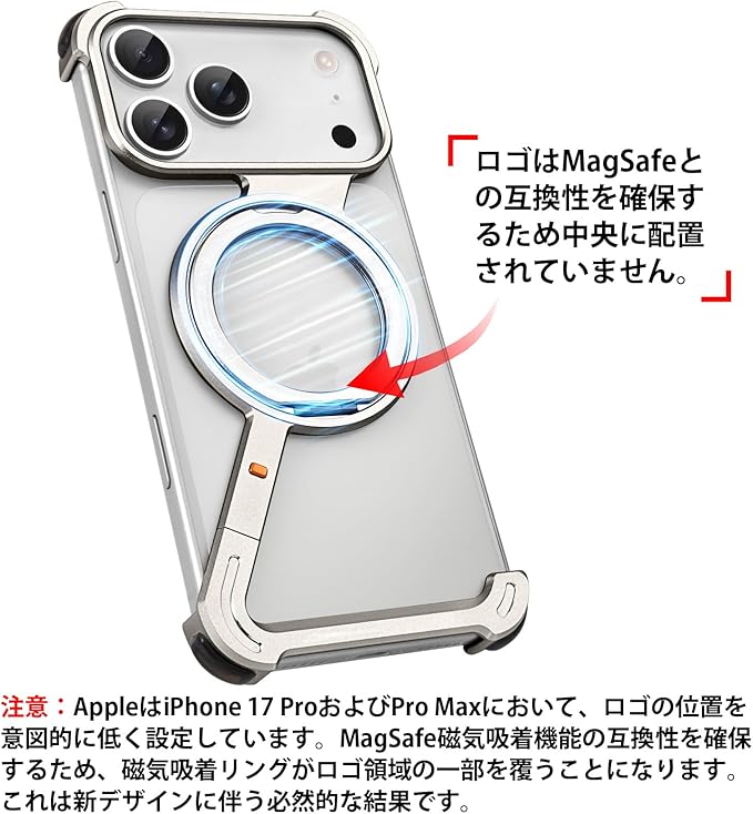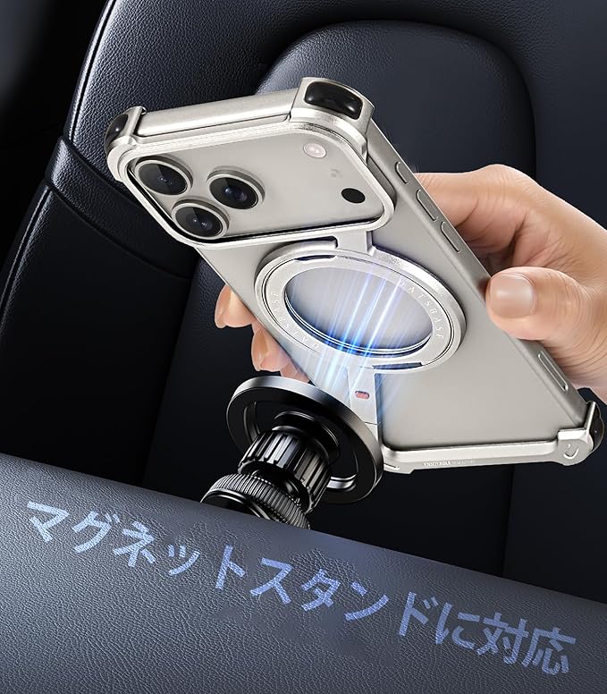 【360 回転スタンド】iPhone 17Promax用のフレームレスケースは360 回転スタンドが搭載して、万能のスタンドようになります。仕事や勉強、遊びや旅行など、どのような場面でもあなたの良い助けになってくれます。iPhone 17Promax用のフレームレスケースはワイヤレス充電対応しません。