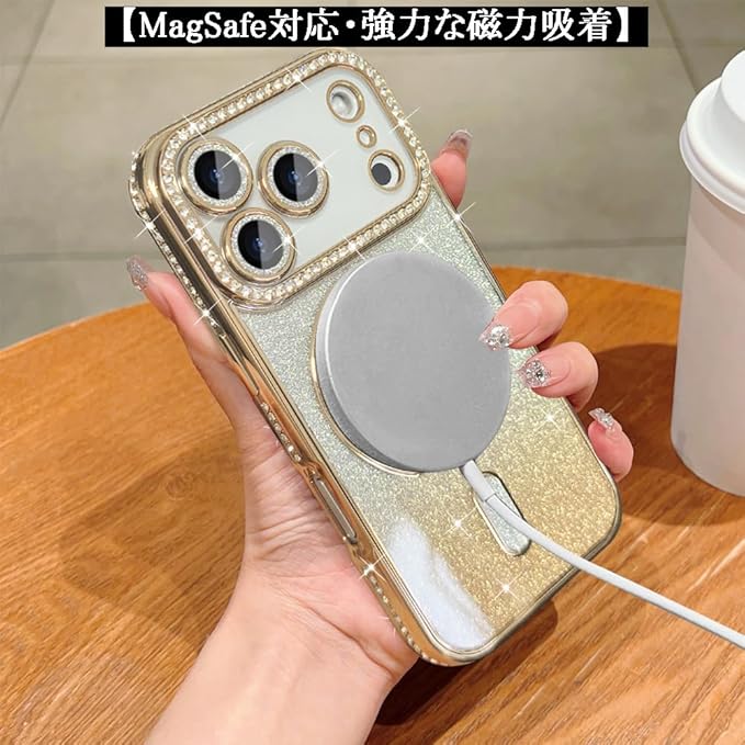 YUYIB スマホケース 対応 iPhone 17 Pro Max ケース MagSafe対応 クリア メッキ加工 ドリル ハートシール きらきら ブリンブリン かわいい おしゃれ 軽量 薄型 衝撃吸収 女性 ストラップ穴あり アイフォン17プロマックス 磁気ケース (ゴールド)