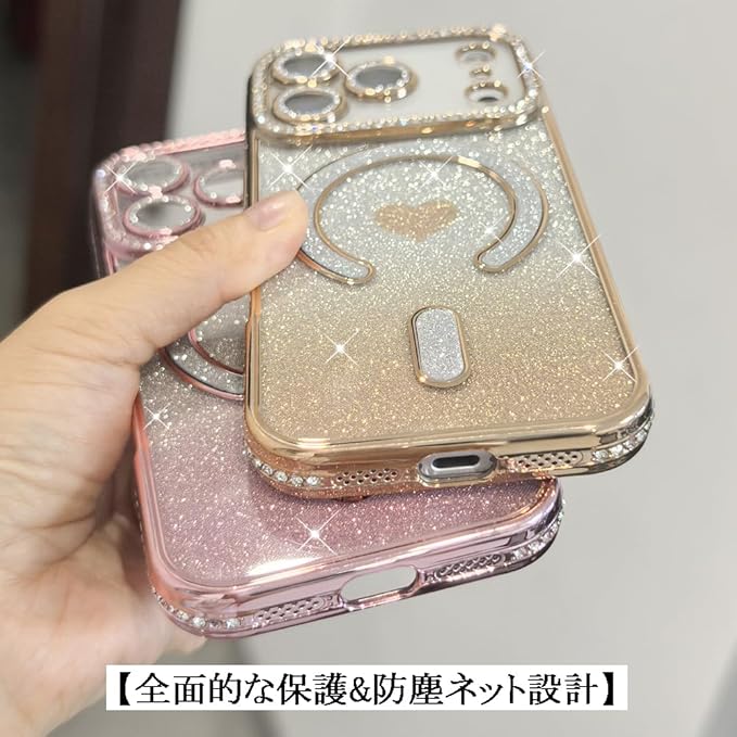 YUYIB スマホケース ケース MagSafe対応 クリア メッキ加工 ドリル ハートシール きらきら ブリンブリン かわいい おしゃれ 軽量 薄型 衝撃吸収 女性 ストラップ穴あり 磁気ケース