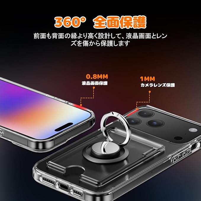 対応 iPhone 17 Pro Max ケース 透明 カード収納 リング付き 耐衝撃 保護カバー アイフォン17プロマックス スマホケース クリア シリコン スタンド機能 耐久 滑り止め (クリア)