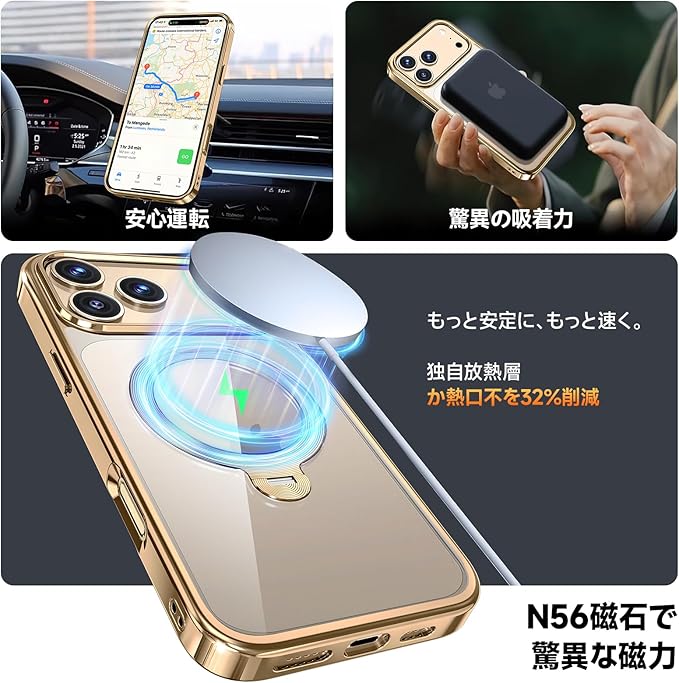 【三重保護セット!上品なメタリック光沢】OYR iPhone 17 Pro Max用クリア ケース Magsafe 対応[360 回転CD スタンド・10 万回開閉テスト][メッキバンパー・iPhone専属色][カメラ保護とガラスフィルム付き]ストラップホール付き マグセーフ アイホン17プロマックスケース マホケース17 Pro Max 人気 米軍MIL規格取得・耐衝撃(6.9インチ・ゴールド)