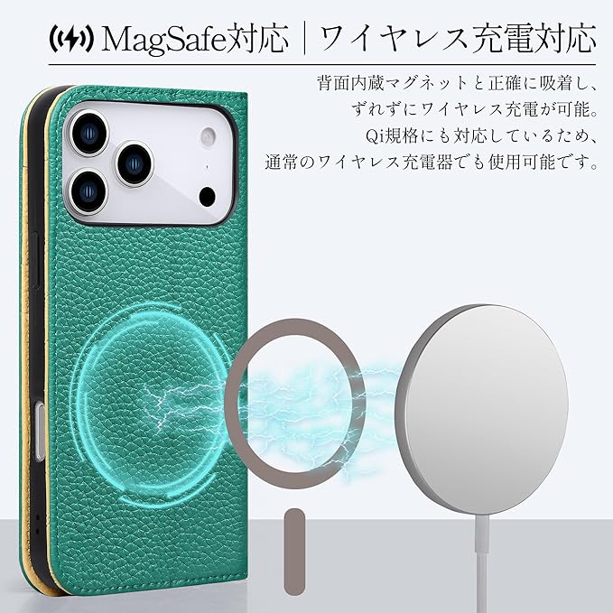 VISOUL iPhone 17 Pro Max 対応 ケース 手帳型 本革 アイフォン17 プロマックス 手帳型ケース MagSafe対応 スマホケース レザー カード収納 携帯カバー 横置きスタンド機能付き マグネット式 全面保護 柔軟なTPU素材 アイホン17 ProMaxコバルトグリーン・レモン