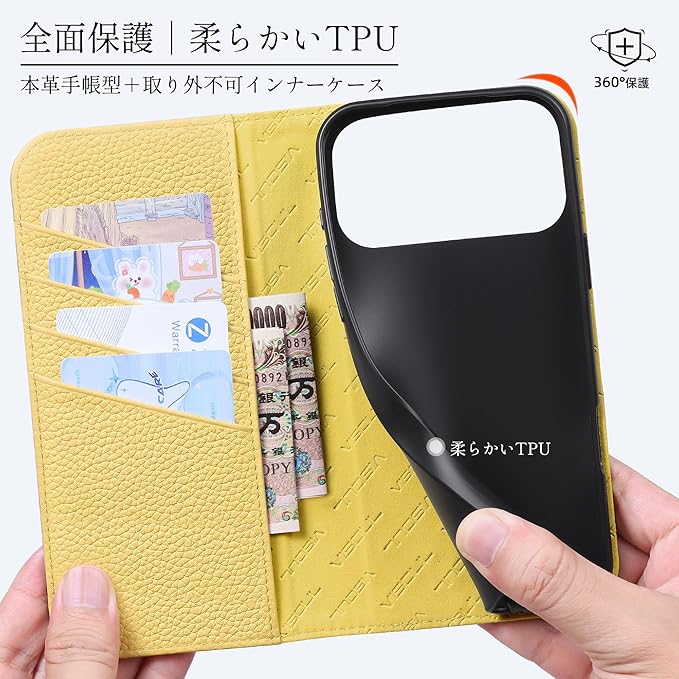 収納機能、横置きスタンド機能:iPhone17 ProMaxケース内側に実用性のカード入れポケット 4、内側ポケット 1、カード類、現金、名刺、免許証入れなどを収納でき、通勤も通学にも楽々タイプです。マグネットが内蔵されているので、ベルトがなくてもフタがぴったり閉まります。横置きスタンド機能が付きまして、好きな角度を調節できて、手放しでも動画視聴や読書に楽しめる。
