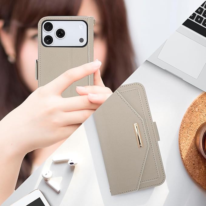 【対応機種】iPhone 17 Pro Max と互換性のあるケース。あいふぉん17Promaxケース手帳型は、モデルやカラーが豊富です。クロスハッチの独特な質感、封筒のようなユニークな文字デザイン、質感のあるゴールドのメタルアクセサリーなど、スタイリッシュでシンプルなデザインに仕上げています。また、メイクアップミラーも付いているので、外出先でもメイクアップを確認でき、毎日の生活がより快適になります。ご注文の際は、対応機種と画面サイズをご確認の上、ご注文ください。
