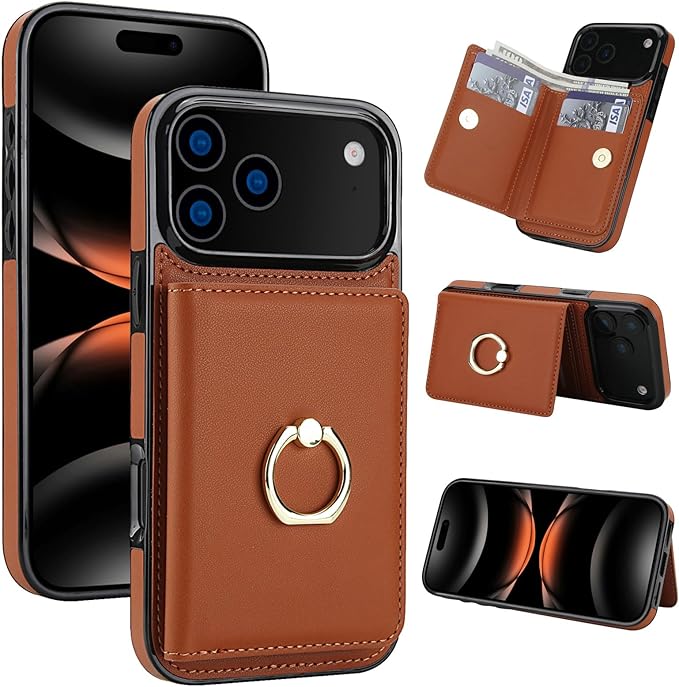 Noaivoky 適用 iPhone 17 Promax ケース 手帳型 アイフォン17 プロマックス ケース 背面カード収納 リング付き スマホケース いphone17Promax 財布型 スタンド機能 携帯カバー PUレザー RFIDブロック機能 おしゃれ あいふおん17プロマックス カバー 防水 耐摩擦 耐衝撃 アイホン17 プロマックス カード リング - 茶色