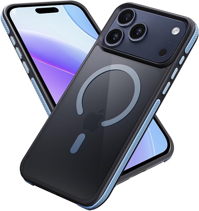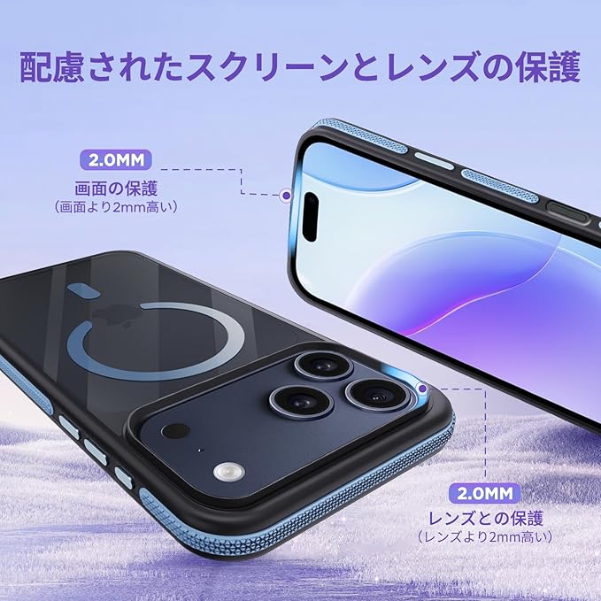 fagazzfu 対応 iPhone 17 Pro Max ケース MagSafe対応 耐衝撃 半透明 【滑り止めと衝突防止のツーインワンエッジ】 対応 iPhone 17 Pro Max スマホケース 衝撃吸収 滑り止め 傷防止の いpほね17ProMax カバー ワイヤレス充電対応 米軍MIL規格 衝突防止ストリップフレーム レンズ保護 薄くて 人気 (ブルー)