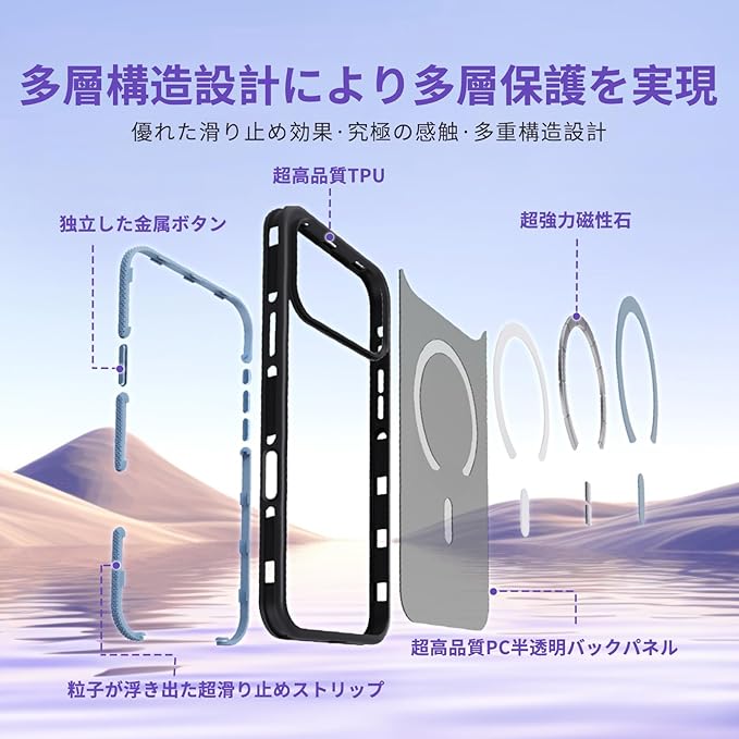 【MagSafe 対応】ハイパワーマグネット内蔵したこのケースは、通常のケースより 2 倍強力な磁力を発揮します。ケースを外すことなく、MagSafe 充電器と自動的に位置合わせし、本来の充電速度を体験できます。また、すべての MagSafe アクセサリと互換性があります。