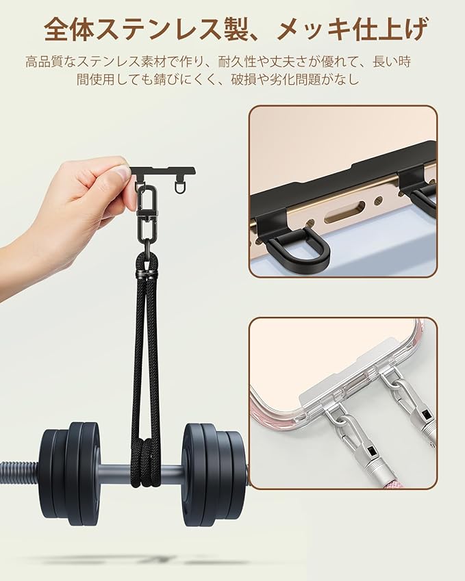 【2口タイプ、iPhone 17シリーズ/iPhone ストラップに対応】: 2つ吊りのホルダーで、iphone 17/17 air/17 pro/17 pro maxのケースとiphone クロスボディストラップに対応できます。本製品は2つの掛けリングをデザインされて、ケースのスピーカー口に通して装着し、充電ケーブルの接続を完全に邪魔しなくて、シールを挟んだままでも充電やイヤホンのケーブルを挿すことができます。
