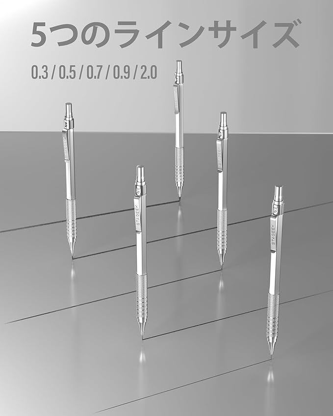 【精巧なアーティストセット】 5本の金属製ドローイングシャープペンシル(0.3、0.5、0.7、0.9、2.0mm)、0.3、0.5、0.7、0.9mmのグラファイト芯の詰め替えチューブ(60本/チューブ、HB)4本、2.0mmのグラファイト芯の詰め替えチューブ(4B、2B、HB、2H、12本/チューブ)4本、12色のカラーチューブ2本、4Bソフト消しゴム2個、練り消しゴム1個、ガム消しゴム1個、鉛筆削り2個、キャップ消しゴムの替え9個、プラスチックケース1個が含まれています。
