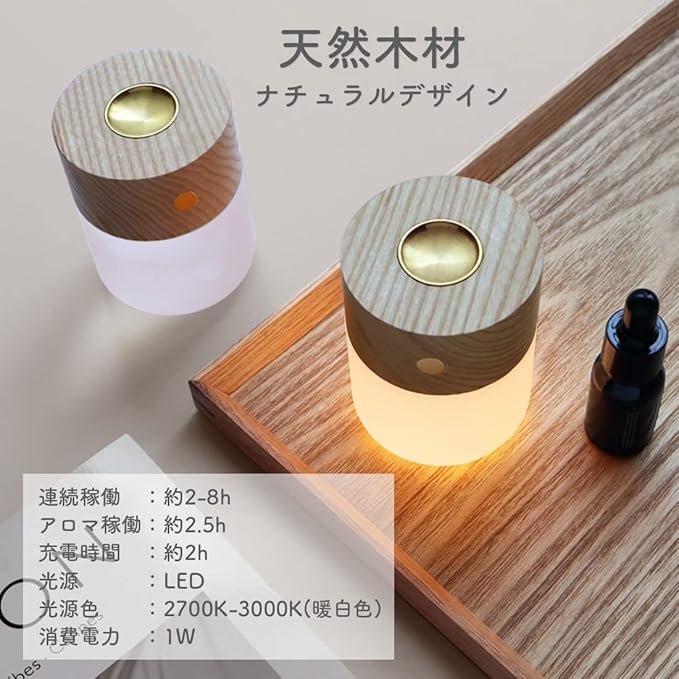 仕様:光源色:暖白色(2700K-3000K)、消費電力:1W、加熱温度:40-65℃、バッテリー容量:800mAh、充電時間:2h、稼働時間:約2-8h(ライト)、約2.5h(アロマ)