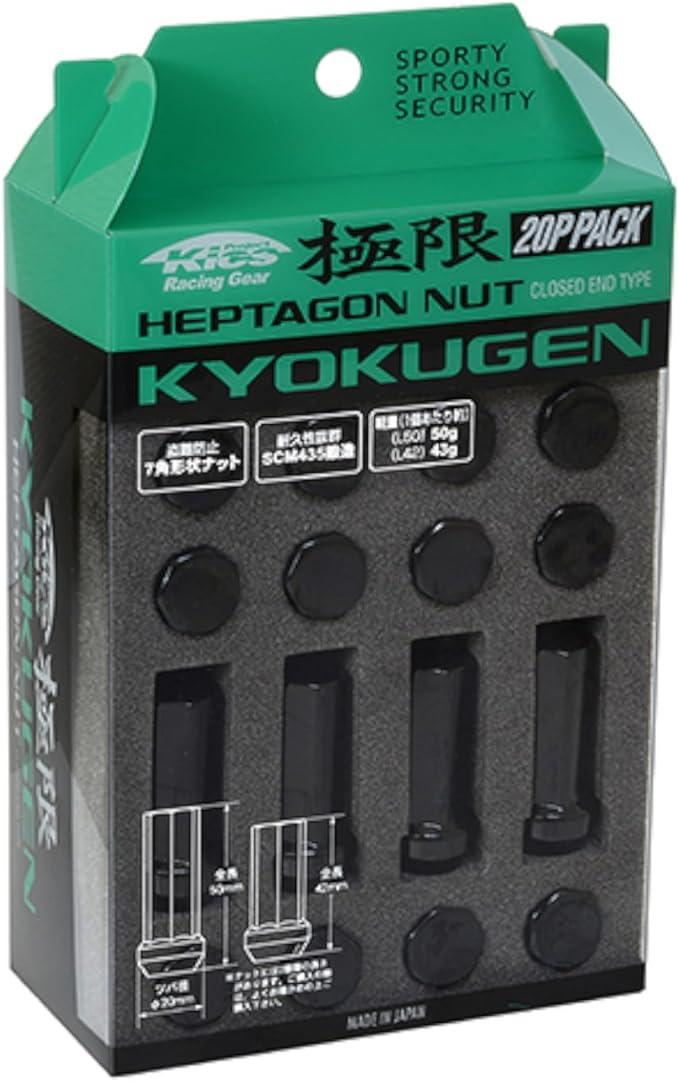 KYO-EI(協永産業) ホイールナット 極限 HEPTAGON NUT 【 M12 x P1.25 】 袋タイプ クロムモリブデン鋼 【 ブラック 】 全長42mm HPF3B4