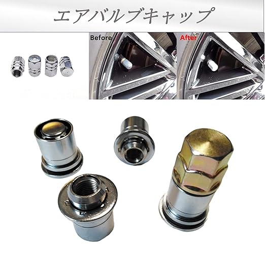 内歯車型のロックナット4個と同似色のエアバルブキャップ4個のセットです。