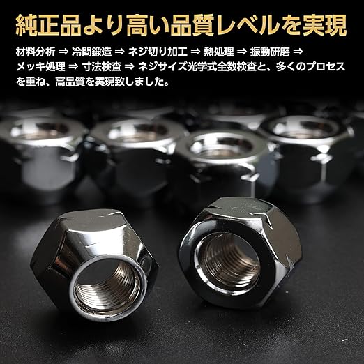 当社の製品は原材料から表面処理、耐久性、硬度等各製造工程を管理し、純正品より高い品質レベルのラグナットを誕生させました。