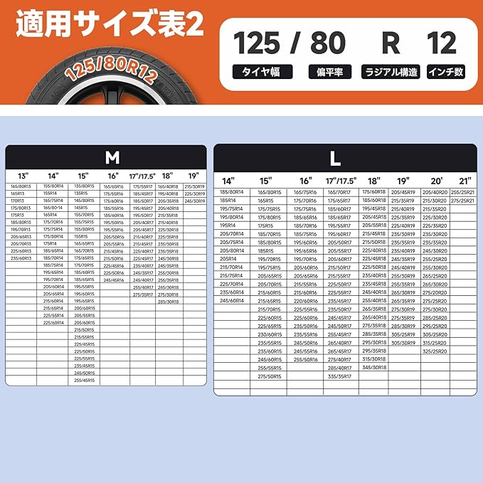 L適応タイヤ2:220/60R16、225/55R16、225/60R16、235/50R16、235/55R16、245/50R16、245/55R16、255/50R16、165/70R17、175/65R17、185/60R17、185/65R17、195/55R17、195/60R17、205/50R17、205/55R17、205/60R17、215/50R17、215/55R17、225/50R17、225/55R17、235/45R17、235/50R17、245/45R17、245/50R17、255/45R17、265/40R17、265/45R17、275/40R17、285/40R17、335/35R17、175/60R18、185/60R18、195/45R18、205/45R18、205/55R18、215/45R18、215/50R18、225/40R18、225/45R18、225/50R18、235/40R18、235/45R18、245/40R18