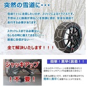 ■ジャッキアップ不要で取り付け可能 ■横滑りに強く静寂性に優れた亀甲型 ※事前に、取り付け、取り外し練習を行ってください ※タイヤチェーン装着時は30km/h以下で走行してください。(高速道路も同様)※この商品はラジアルタイヤ(夏用タイヤ)基準となっております。スタッドレスタイヤなど、一部装着できない場合があります。※装着にはタイヤと車体の間隔(クリアランス)が5cm以上必要です。また、車体と積載物の合計重量が2t以内でないと装着できません。