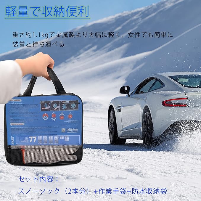 【使用便利】:雪道走行用タイヤ、布製滑り止めスノーソック2本分セット、専用収納パック1個、手袋2個。収納サイズ:約27*25*7cm、重さ:約1.1kgで、防水収納袋に小さく収納でき、また超軽量なので、冬のアウトドア活動や緊急用として車に置けておくのはお邪魔にならないし、安心です。冬場雪、雪対策、路面凍結、砂道、泥道。より安全でより快適に。冬の必需品。