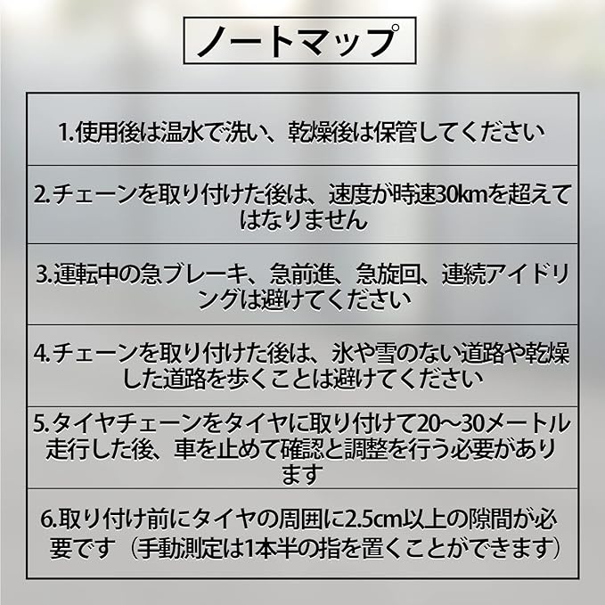 <パッケージ内>1 スノーチェー、1 1PZ ボックス(紙の説明書はございません。取付方は商品ページに掲載されているビデオまでご参考ください。)