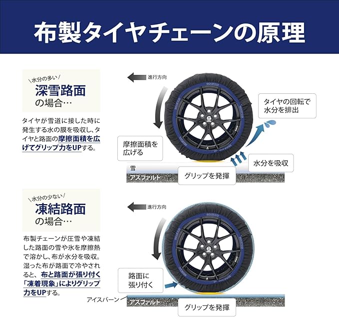 ■簡単装着:ジャッキアップ不要。車種を選びません。3分程で素早く簡単に装着可能です。「スパルコ・スノーソックス」はどなたでも簡単装着。タイヤ上部から被せて車輌をすこし前進、さらに残り部分被せて、車両を動かすと自動で正しい装着位置に収まります。■静音小振動:静音性は金属チェーンよりも明らかな優位性能。「スパルコ・スノーソックス」の最大の特徴で、非常に静かで乗り心地を損ないません。布製なのでタイヤ、アルミホイールにもダメージを与えません。スチールチェーン使用の場合は走行時、ホイールに傷などダメージを与える場合があります。さらに、スチールチェーンはある程度走行した後に締め直しが必要ですが、「スパルコ・スノーソックス」は多少曲がって装着しても、走行中に自動的に補正し、センターリングされます。