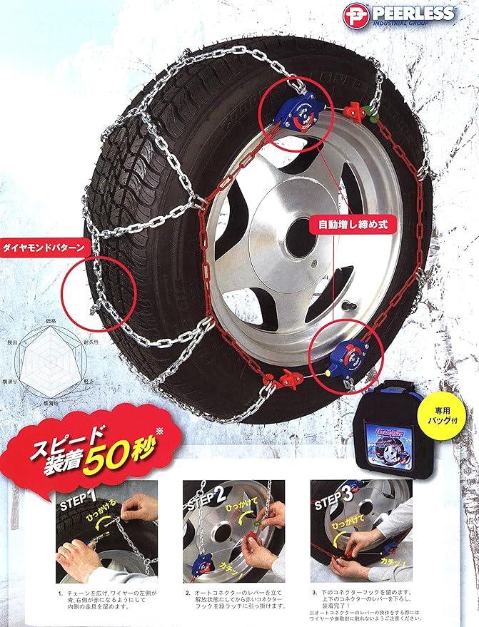 ワンタッチで自動増し締めできる、乗用車向け楽々チェーン。