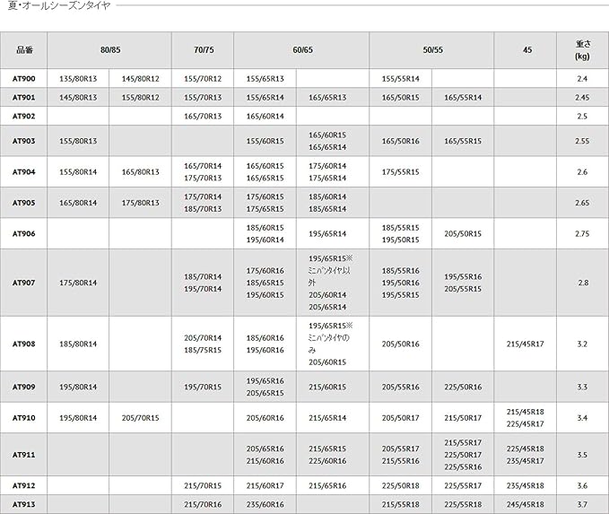 夏・オールシーズンタイヤ: 175/80R14、185/70R14、195/70R14、175/60R16、185/65R15、195/60R15、195/65R15※ミニバンタイヤ以外、205/60R14、205/65R14、185/55R16、195/50R16、195/55R15、195/55R16、205/55R15、185/60R16