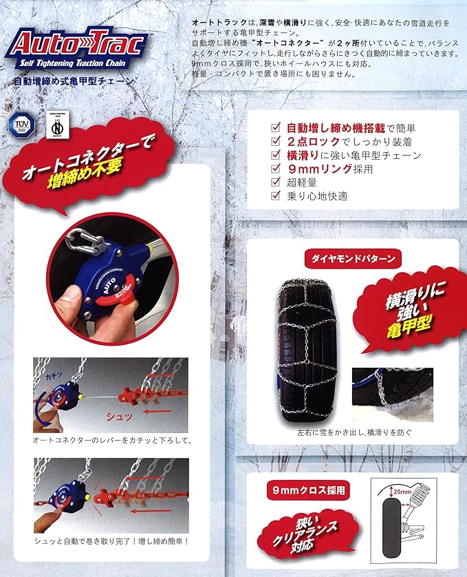 オートトラックは深雪や横滑りに強く、もっと安全・快適にあなたの雪道走行をサポートするダイヤモンドパターンチェーン。
