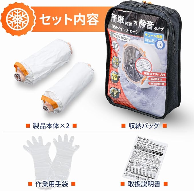 ソックスの名のとおりタイヤに簡単に履かせられ、走行中は金属チェーンがぶつかる音がないので静かです。