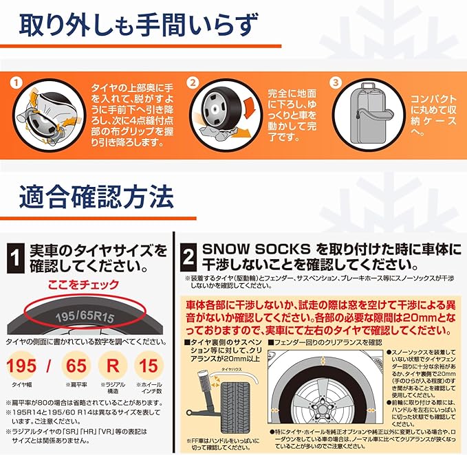 ●夏・冬タイヤに対応。急な積雪でも簡単に装着できます。
