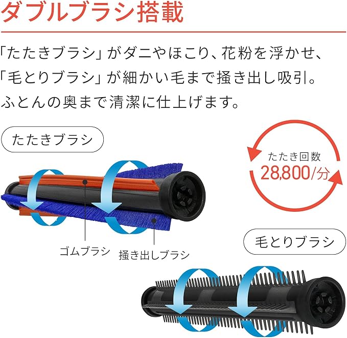 たたきブラシと毛とりブラシのダブルワイドブラシ搭載。たたき回数28,800回/分でふとんの花粉やダニ、細かい毛など掻き出し吸引。ふとんの奥まで清潔に仕上げます。毛取りブラシで細かい毛の除去率がさらにアップ。