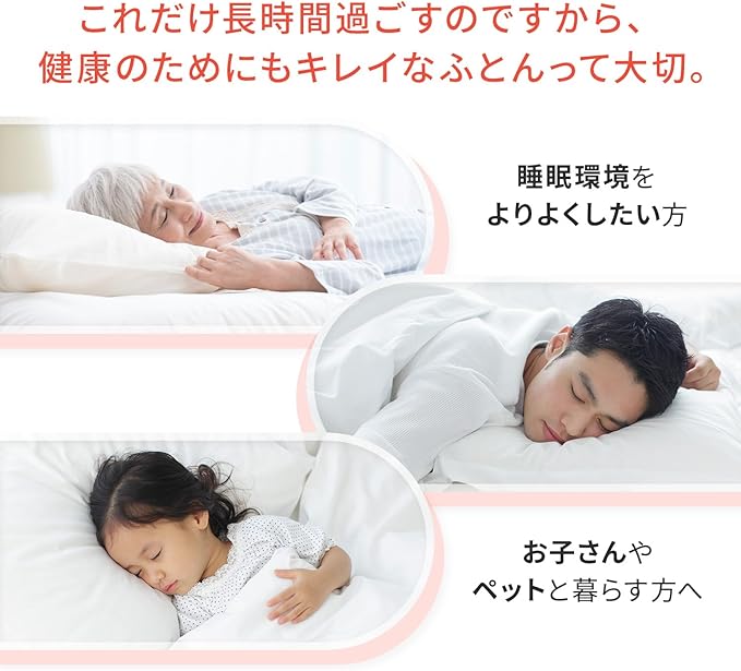 【家族の睡眠を守る布団クリーナー】成人の平均睡眠時間は1日7時間~8時間。赤ちゃんの平均睡眠時間は1日16時間~20時間。これだけの長時間過ごすふとんは健康のためにも綺麗にしたい。そのためAQUAのふとんクリーナーは徹底的に「清潔さ」にこだわりました。