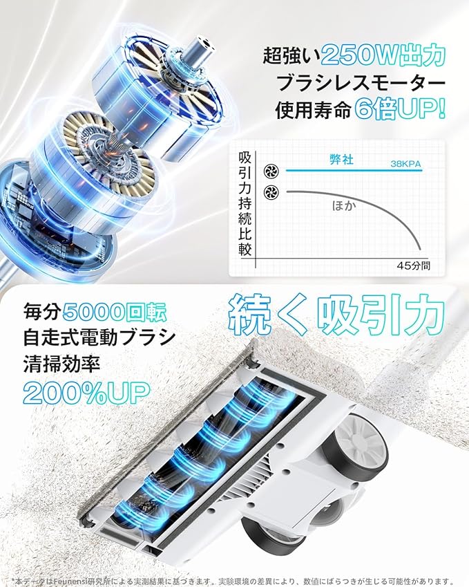 ●【強さの理由――掃除機の基本に忠実。】 コードレスでも、吸引力に妥協しません。◆【55KPA強力吸引】EB102はブラシレスモーター(250W) サイクロン式を採用し、毎分12万回転・最大55000Pa・80000Gの強力な吸引力を実現。電動ローラーブラシは毎分5,000回転し、微細なゴミや毛もしっかり吸引します。気になるカーペットの奥の汚れまで、力強く一掃します。◆【サイクロン式】サイクロン構造でゴミが詰まりにくく、吸引力が長く続きます。さらに従来比200%の集塵効率向上も実現。細かいホコリや髪の毛までグングン吸引。◆【2段吸引】吸引モードは2段階切替で、掃除の場所や時間帯に合わせて柔軟に対応できます。「畳の目間の微細なゴミから車のシート溝に詰まった砂粒まで、奥深くの汚れを一掃します。」との声をいただいています