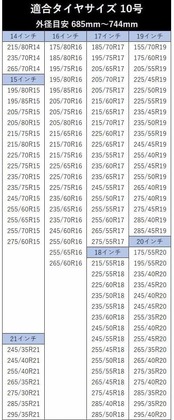 適合タイヤサイズ(10号) 外径目安(685mm~744mm)