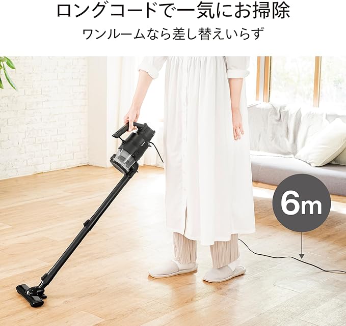 【お掃除しやすいロングコード】コードの長さが6mあり、6畳のワンルームや長い廊下でもコンセントの差し直しなしでストレスがなくスムーズに掃除ができます。