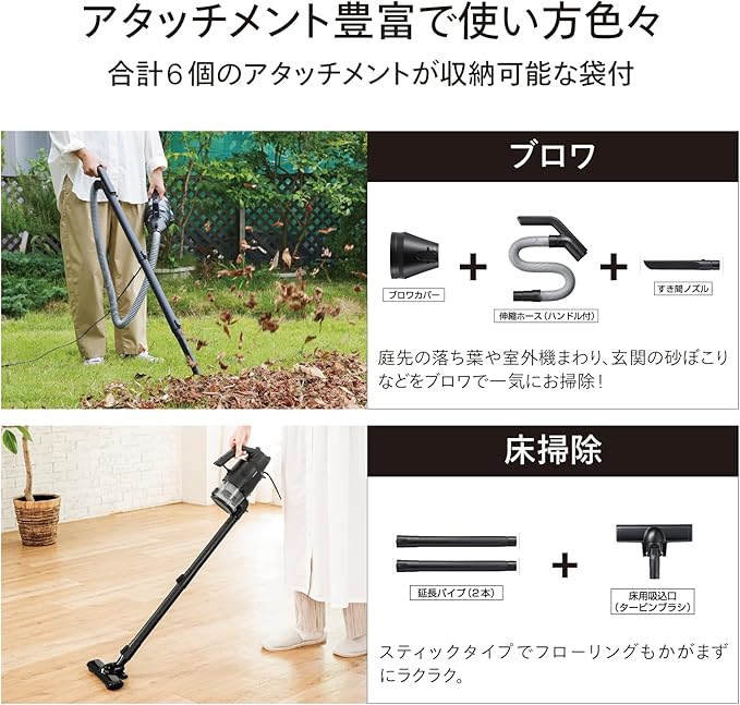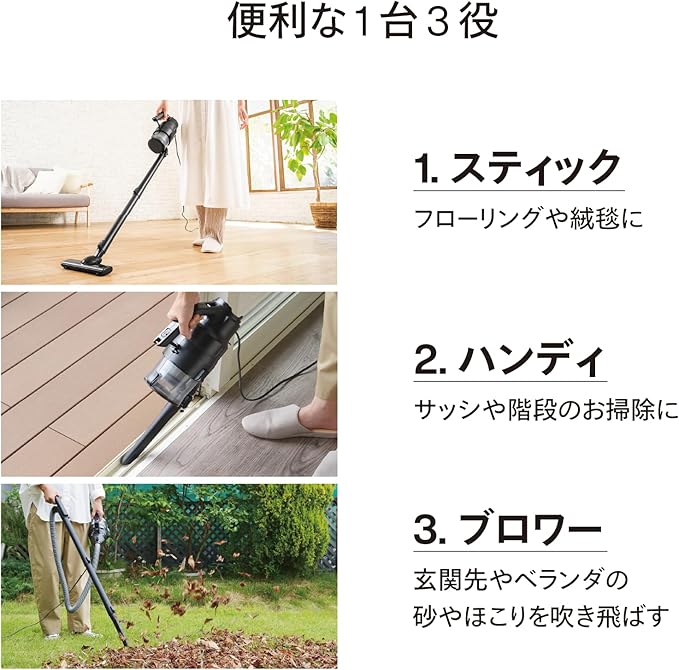 【ブロワー機能付き3WAY】スティックとハンディはもちろん、ブロワカバーを装着することで、玄関や庭先の砂や落ち葉の吹き飛ばし掃除ができるブロワとしてもお使いいただけます。