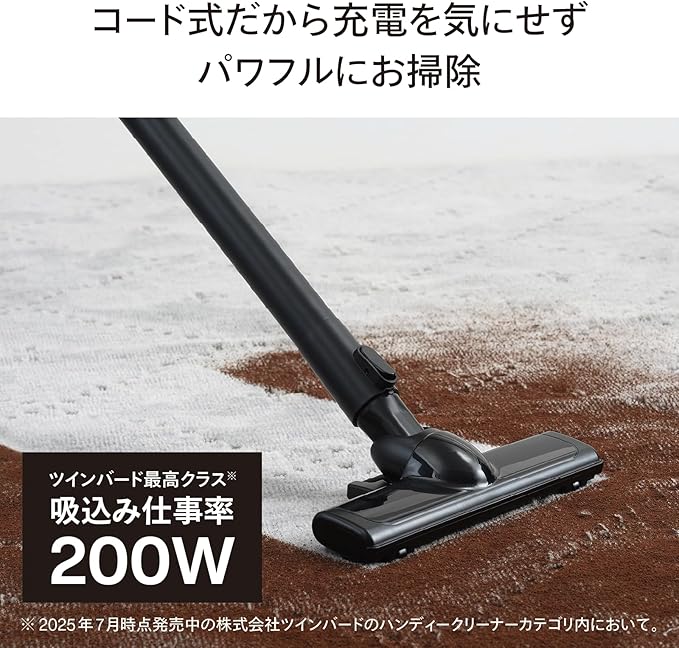 【ツインバード最高クラスの吸込仕事率】吸込仕事率200Wのハイパワーで、細かいゴミも素早く吸込み、お掃除時間の短縮に貢献します。