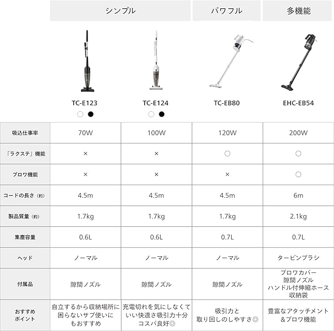 EHC-EB54Bは、ツインバード最高クラス、吸引力抜群な200Wのパワーハンディクリーナー。約6mの電源コードと5種類の豊富なアタッチメントで家のさまざま場所をお掃除でき、1台で大掃除ができます。ゴミ捨て便利な「ラクステ機能」を搭載し、お手入れもらくらく。