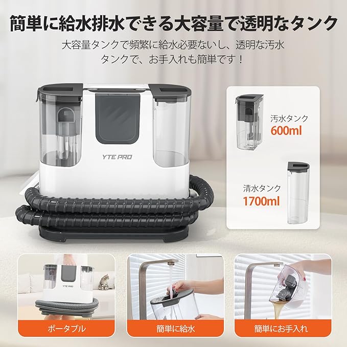 YTE PRO カーペットクリーナー 2025新登場 400W 強力吸引 リンサークリーナー 60℃お湯対応 自動洗浄 染み抜き 乾湿両用 掃除機布洗浄機 シートリンサー ソファ/絨毯/布製品/車内/ぬいぐるみ/ダウンコート/隙間 持ち運び便利 お手入れ簡単 PSE認証済み 12ヶ月品質保証
