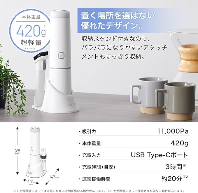 特徴 HEPA, コードレス, 充電式, 収納スタンド