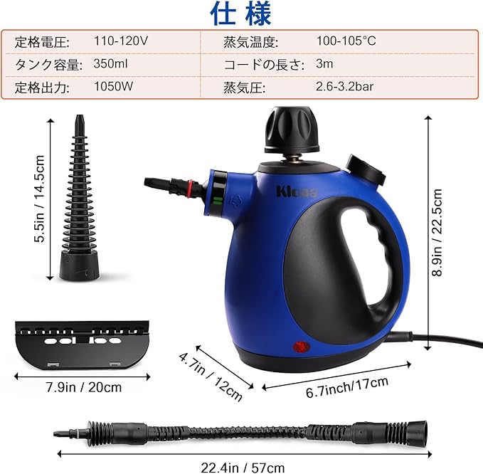 【アクセサリー10点セット】: Klona のスチーマーは、クリーニングとアイロンがけの素晴らしい仕事をしてくれます。付属品10点セット:角度のついたノズル、曲げられるエクステンション、ブラシ付きノズル、布用スチーマーツール、窓/ドア用ゴムワイパーなど。キッチンシンク、畳、カウンタートップ、トイレ、バーベキューグリル、シャワーカーテン、床、子供のおもちゃ、ペットのマットレス、ソファ、車、衣類など。