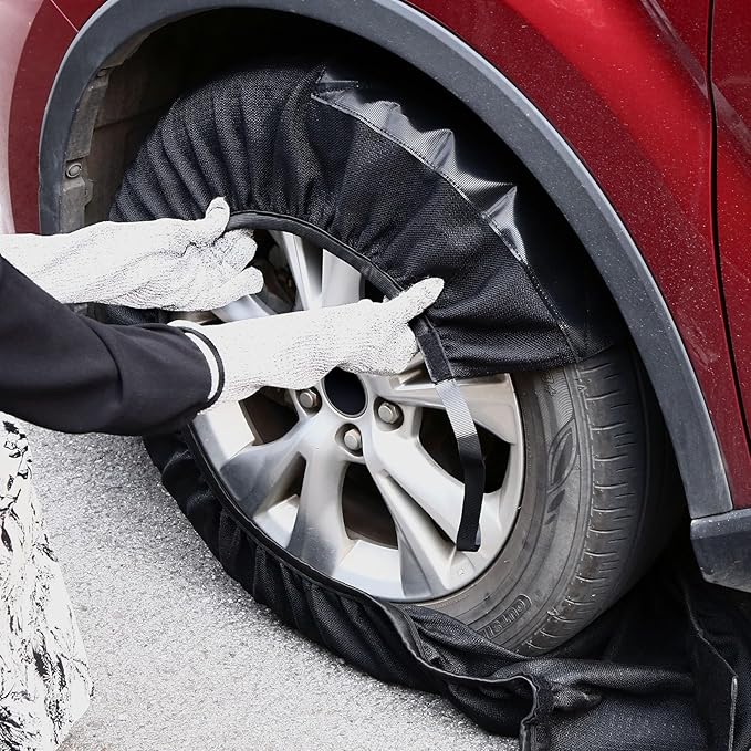 【取り付け簡単】スピード制限:時速40km以下;ジャッキアップが不要、タイヤに被せて、タイヤのサイズに合わせて、調整して、マジックテープで止めるだけ、とても簡単です。前輪駆動車は前輪に、後輪駆動車は後輪に装着してください