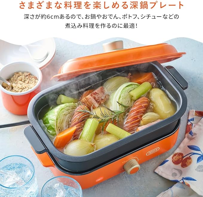 【幅広い料理をお任せ!】火力は保温~200℃まで無段階で調節可能。ふたも付属しているため、焼くだけではなく蒸し料理など、さまざまなレシピでお使いいただけます。