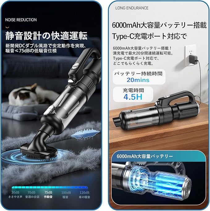 【TYPE-C充電&2*3000mAh大容量バッテリーで長時間駆動】 TYPE-C充電に対応し、約4時間でフル充電完了。最大20分間の連続使用が可能で、マンション一軒分の掃除や車内の隅々まで一気にクリーニング。充電式掃除機として一人暮らし 掃除機に最適。戸建住宅でもマンションのお部屋でも、ラクにお掃除を完了できます。(最大120㎡対応)