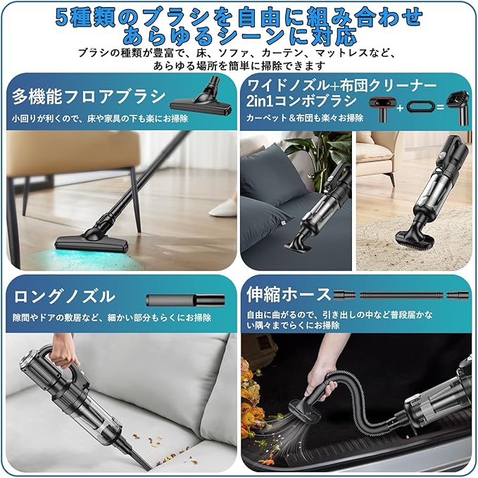 【18000PAの超強力吸引力&5種類専用ノズル搭載】 業界トップクラスの18000PA吸引力で、微細なホコリ・ペットの毛・食べカスまで一瞬で吸引。フロアブラシ(フローリング掃除専用)、隙間用スリムノズル(ソファやエアコン上部の狭い隙間)、布団用ブラシ(ダニ・花粉対策)、広口毛ブラシ(カーペットや家具表面の広域クリーニング)、延長ホース(引き出し内部やシート下の手が届きにくい場所)の5種類を完備し、家中・車内のあらゆる汚れを徹底除去。