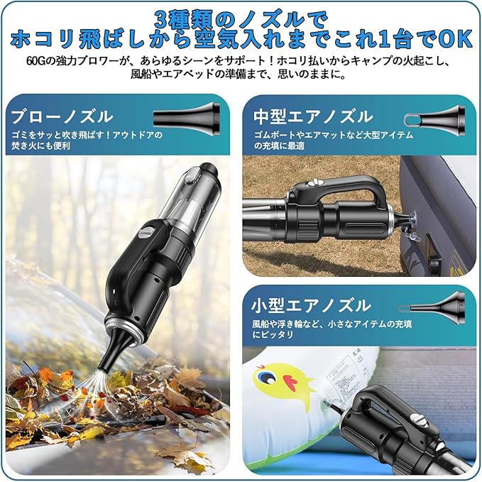 【送風&充気モード】ブローノズルを装着した送風モードは、50Gの強風圧で瞬時に窓枠、キーボードの隙間、エアコン吹き出し口などのほこりや砂を吹き飛ばします。さらに、充気の2種類のノズルを使用して、風船、エアマットレス、浮き輪に空気を充填することも可能です。アウトドアや家庭用のさまざまなシーンに最適です。