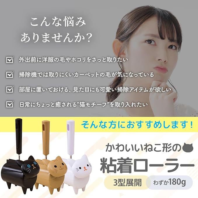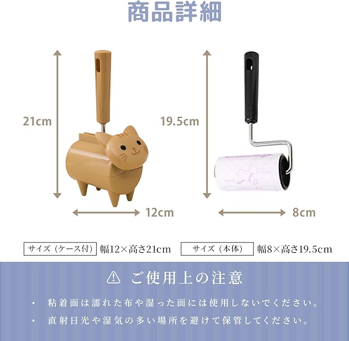 【外出先でも便利に使える】持ち運びしやすいサイズ感なので外出先や職場でも使いやすく、気になった毛やホコリをその場ですぐに取り除けるのが大きなポイントです。 【ねこの毛もスッキリ除去】ねこの抜け毛が気になる衣類や布製品にも粘着力がしっかり働き、毎日の掃除が手間なく簡単にできて清潔な空間を保つことができます。 【カーペットも簡単に掃除】カーペットに絡んだホコリや細かいゴミを巻き取りながら、表面を傷めずに掃除できるため、力を入れなくても快適に作業が続けられます。