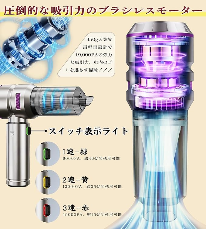 ✅【コードレスで3段階強力吸引力調整】:スタイリッシュなデザインで重量わずか450g、業界最軽量クラスのハンディクリーナー。最大8AW/19,000Paの強力吸引力で車内の微細なゴミも確実に吸引。弱・中・強の3段階から最適な吸引力を選択可能で、あらゆるシーンに対応します。